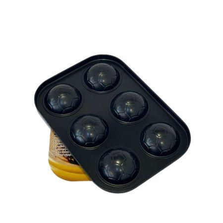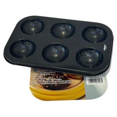 Изготовлена из углеродистой стали с двухслойным антипригарным покрытием. Углеродистая сталь обладает высокой теплопроводностью, что обеспечивает быстрый и равномерный нагрев, что важно для идеального приготовления. Благодаря антипригарному покрытию готовая выпечка легко отстает от стенок. Форма имеет 6 порционных отделений. диаметром 6,5 см, что очень удобно для выпекания кексов и пирожных. Внешне форма очень привлекательна, черного матового цвета. Не рекомендуется использовать металлические лопатки и ножи – они могут повредить покрытие. Лучше брать силиконовые или деревянные инструменты. Не использовать жесткие щетки, скребки и агрессивную химию – они разрушают антипригарный слой.