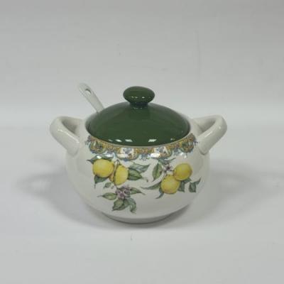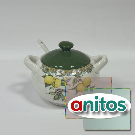 Сахарница 3пр 375мл Лимонный праздник доломит LR (х36). Материал: доломит. Цвет: теплый белый, желтый, зеленый. Рисунок: Лимоны. Набор 3 предмета: сахарница - 1 шт, крышка - 1 шт, ложка - 1 шт. Объем: 375 мл. Диаметр корпуса: 11,5 см. Диаметр горлышка: 7 см. Диаметр дна: 6 см. Длина с ручками: 14 см. Высота борта: 7 см. Высота с крышкой: 9,5 см. Длина ложки: 13 см.