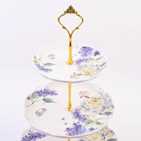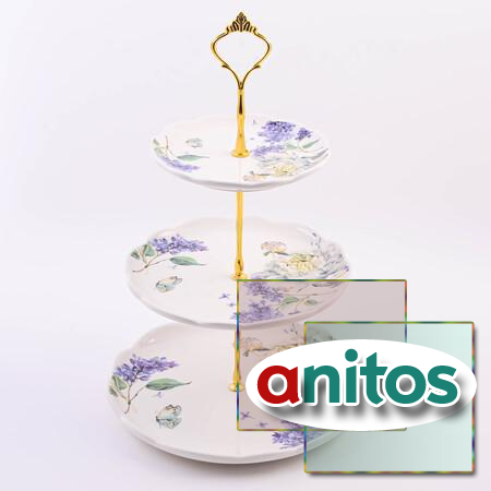 Элегантная конфетница с тремя ярусами LORAINE станет настоящим украшением любого стола, поможет хозяйке красиво подать конфеты, фрукты, орехи, выпечку, овощи и даже закуски из мясных и сырных деликатесов. Блюдо выполнено из БИО и ЭКО доломитовой керамики высокого качества и украшена красивым цветочным рисунком с бабочками. Стойка держатель выполнена из металла с золотым покрытием. Благодаря своей трехъярусной конструкции, этажерка на стол позволит вам разместить большое количество сладостей. Основание фруктовницы обеспечивает ей высокую устойчивость, что делает ее безопасной для использования даже на самых неровных поверхностях. Вы можете быть уверены, что ваша ваза для фруктов будет стоять надежно, не опасаясь, что она может перевернуться или сломаться. Фруктовница трехъярусная прекрасно подойдёт под любой интерьер и будет сочетаться с сервировочной посудой, а компактные размеры позволят разместить ее даже на небольшом праздничном столе. Эта красивая посуда для дома украсит сервировку вашего стола и подчеркнет прекрасный вкус хозяина, а также станет отличным подарком.