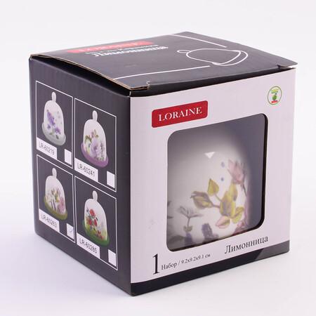 Лимонница с крышкой LORAINE это прекрасный аксессуар для любителей свежих цитрусовых. Красивая лимонница изготовлена из БИО и ЭКО доломитовой керамики высокого качества и украшена красивым цветочным рисунком с цветами. Керамика один из лучших материалов для использования в быту, долговечна и отлично впишется в любой интерьер кухни. Набор состоит из двух предметов блюдце и крышка. Для удобства использования свеху на крышке есть ручка. Удобный контейнер для хранения лимонов надежно защищает содержимое от посторонних запахов и заветривания. Оригинальный дизайн и качество исполнения сделают тарелку для лимона настоящим украшением стола и подчеркнет прекрасный вкус хозяйки. Благодаря своей форме, она подходит для хранения не только лимона, но и других цитрусовых фруктов. Керамическая посуда подходит для использования в микроволновой печи, холодильнике и посудомоечной машине. Изделие упаковано в индивидуальную коробку. Такая лимонница керамическая прекрасно подойдет для вашей кухни и будет отличным подарком для друзей и близких.
