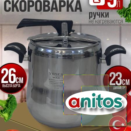Объем: 9 л. Диаметр горлышка: см. Диаметр корпуса: 23 см. Диаметр дна: 18см. Длина с ручками: 37 см. Высота борта: 26 см. Высота с крышкой: 31.5 см. Клапан контроля давления: есть. Клапан избыточного давления: есть. Максимальное давление: 0,55 Бар