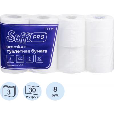 Бумага туалетная 30 м SoffiPro Premium, без тиснения 3 слоя 8 рул/уп