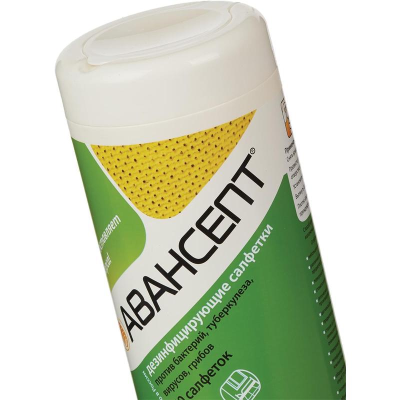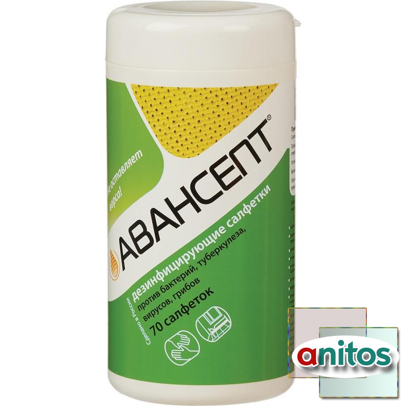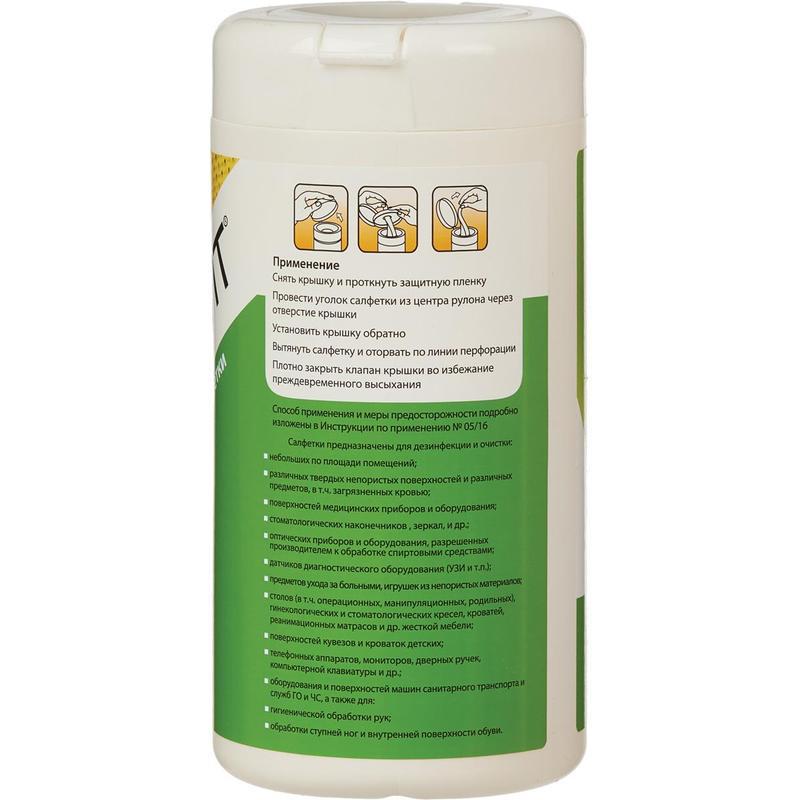 Равномерно пропитанные салфетки из нетканого материала желтого или белого цвета со слабым специфическим запахом спирта. Каждая салфетка пропитана дезинфицирующим средством в объеме 3 г на одну салфетку. Состав пропитки: в качестве действующего вещества содержатся: пропанол-1 28%, ЧАС 0,02%, ПГМБ 0,04%, третичный амин 0,02%, а также вспомогательные компоненты и вода. Область применения: очистка и дезинфекция различных твердых непористых поверхностей и предметов, поверхностей медицинских приборов и оборудования (в том числе аппаратов искусственного дыхания, оборудования для анестезии), стоматологических наконечников, зеркал, предметных стекол, датчиков диагностического оборудования (УЗИ и т. п.), наружных поверхностей шлангов гибких эндоскопов и колоноскопов, поверхностей кувезов и детских кроваток, кресел (гинекологических, стоматологических), столов, мебели, офисной техники, телефонных аппаратов, дверных ручек и т. п., для гигиенической обработки рук, для обработки ступней с целью профилактики грибковых заболеваний. Препарат обладает антимикробным действием в отношении: грамположительных и грамотрицательных бактерий (включая возбудителей ВБИ, микобактерии туберкулеза, кишечные инфекции), вирусов (ОРВИ, герпес, полиомиелит, гепатиты всех видов, ВИЧ-инфекция, аденовирус, грипп (в том числе H5N1, H1N1) и т. д., грибов рода Кандида, Трихофитон. Упаковка: пластиковая туба, содержащие 70 салфеток. Срок годности: 3 года в невскрытой упаковке производителя, 4 месяца после вскрытия защитной пленки.