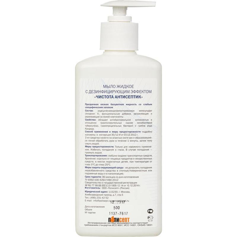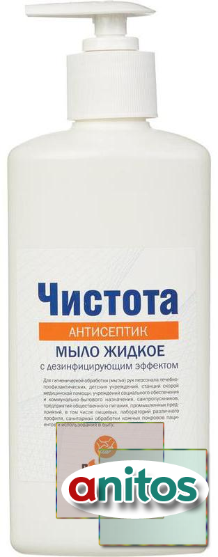 Дезинфицирующее мыло 'Чистота Антисептик' 500 мл. Назначение: гигиеническая обработка рук, санитарная обработка кожных покровов. Обладает хорошими моющими свойствами. Защищает и увлажняет кожу. Не содержит красителей и ароматизаторов. рН: 5-7. Не раздражает кожу. Состав: ундециленамидопропилтримониум метосульфат (тетранил У) 1,5%, функциональные добавки, увлажняющие и ухаживающие за кожей компоненты.