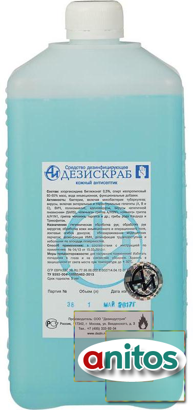 Антисептик кожный "Дезискраб" спиртовой 1 л. Химический состав средства: гуанидин, спирты, вспомогательные компоненты. Действующие вещества: изопропиловый спирт (пропанол-2) 60 %, хлоргексидина биглюконат 0.46 %, вспомогательные компоненты. Сфера применения: акушерские стационары, ЛПУ, клинические лаборатории, бактериологические лаборатории. Объекты обработки: гигиеническая обработка рук, обработка инъекционного поля, обработка локтевых сгибов доноров, обработка операционного поля, обработка рук операционных медицинских сестер, акушерок и других лиц, участвующих в операциях и приеме родов, обработка рук хирургов, перчатки (из каучука, латекса, неопрена и т.д.). Класс опасности: при введении в желудок - 4; при нанесении на кожу - 4; рабочего раствора - 4. Активно в отношении: бактерии (Mycobacterium tuberculosi, возбудители ВБИ, грамотрицательные бактерии, грамположительные бактерии), вирусы (ВИЧ, парентеральных гепатитов, полиомиелит), патогенные грибы (дерматофитон, кандида). Срок годности: 2 года. Страна производства: Россия.