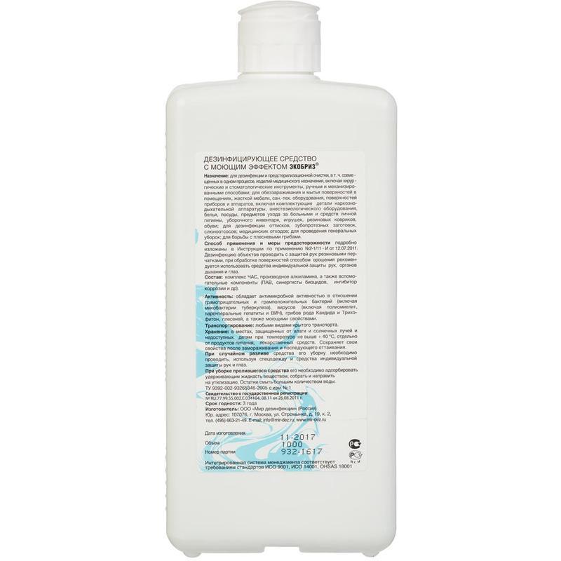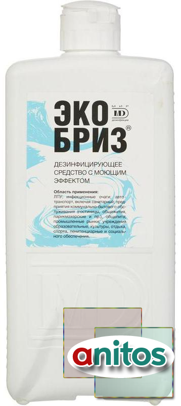 Дезинфицирующее средство 'Экобриз' 1 л (концентрат). Химический состав дезсредства: ЧАС, третичный амин, вспомогательные компоненты. Действующие вещества: N,N-бис(3-аминопропил)додециламин 2.3 %, алкилдиметилбензиламмоний хлорид (АДБАХ) + дидецилдиметиламмоний хлорид 1.8 %, вспомогательные компоненты. Сфера применения: ЛПУ, клинические лаборатории, бактериологические лаборатории, детские учреждения (детсады, школы и т.п.), инфекционные очаги, предприятия общественного питания, коммунальные объекты (бани, бассейны, гостиницы, общественные туалеты и т.п.), учреждения соцобеспечения, парикмахерские, косметические и (или) массажные салоны, прачечные, санитарный транспорт, учреждения культуры, отдыха (кинотеатры, музеи, театры), спортивные и культурно-оздоровительные комплексы. Объекты обработки: аппараты искусственной вентиляции легких, белье нательное, белье постельное, гибкие эндоскопы, жесткая мебель, жесткие эндоскопы, игрушки, ИМН из металлов, резин на основе натурального и силиконового каучука, стекла, пластмасс, ИМН обычные, ИМН одноразовые перед утилизацией, инструменты к эндоскопам, инструменты парикмахерских, массажных, косметических салонов, инструменты стоматологические, инструменты хирургические, лабораторная посуда, мед. отходы из текстильных материалов (ватные и марлевые тампоны, марля, бинты), наркозно-дыхательная аппаратура, обувь, плевательницы, поверхности в помещениях, поверхности приборов и аппаратов, предметы для мытья посуды, предметы личной гигиены, предметы ухода за больными, резиновые и полипропиленовые коврики, санитарно-техническое оборудование, слюноотсосы, спецодежда, стоматологические материалы (оттиски из альгината, силикона, полиэфирной смолы, зубопротезные заготовки, артикуляторы), уборочный инвентарь. Основные режимы применения средства (концентрация/время): дезинфекция поверхностей по бактериям (исключая туберкулез) (0.25 %/120 мин., 0.5 %/60 мин.), дезинфекция поверхностей по вирусным инфекциям (2.5 %/60 мин.), дезинфекция поверхностей по кандидозу (1.25 %/120 мин., 2.5 %/60 мин., 5 %/30 мин.), дезинфекция поверхностей по дерматофитам (4 %/120 мин., 7.5 %/90 мин., 10 %/60 мин.), дезинфекция поверхностей по туберкулезу (4 %/120 мин., 7.5 %/90 мин., 10 %/60 мин.), дезинфекция ИМН при бактериальных, вирусных инфекциях и кандидозе (4 %/60 мин., 7.5 %/30 мин., 10 %/15 мин.), дезинфекция, совмещенная с псо ИМН при бактериальных, вирусных инфекциях и кандидозе (4 %/60 мин., 7.5 %/15 мин.), предстерилизационная очистка ИМН (1 %/10 мин., 1.25 %/15 мин.). Класс опасности: при введении в желудок - 4; при нанесении на кожу - 4; рабочего раствора - 4. Активно в отношении: - бактерии (Mycobacterium tuberculosi, грамотрицательные бактерии, грамположительные бактерии); - вирусы (ВИЧ, парентеральных гепатитов, полиомиелит); - патогенные грибы (дерматофитон, кандида). Особые свойства: сохранение свойств при замораживании/размораживании. Срок годности: в упаковке - 3 года, в рабочем растворе - 14 дней. Страна производства: Россия.