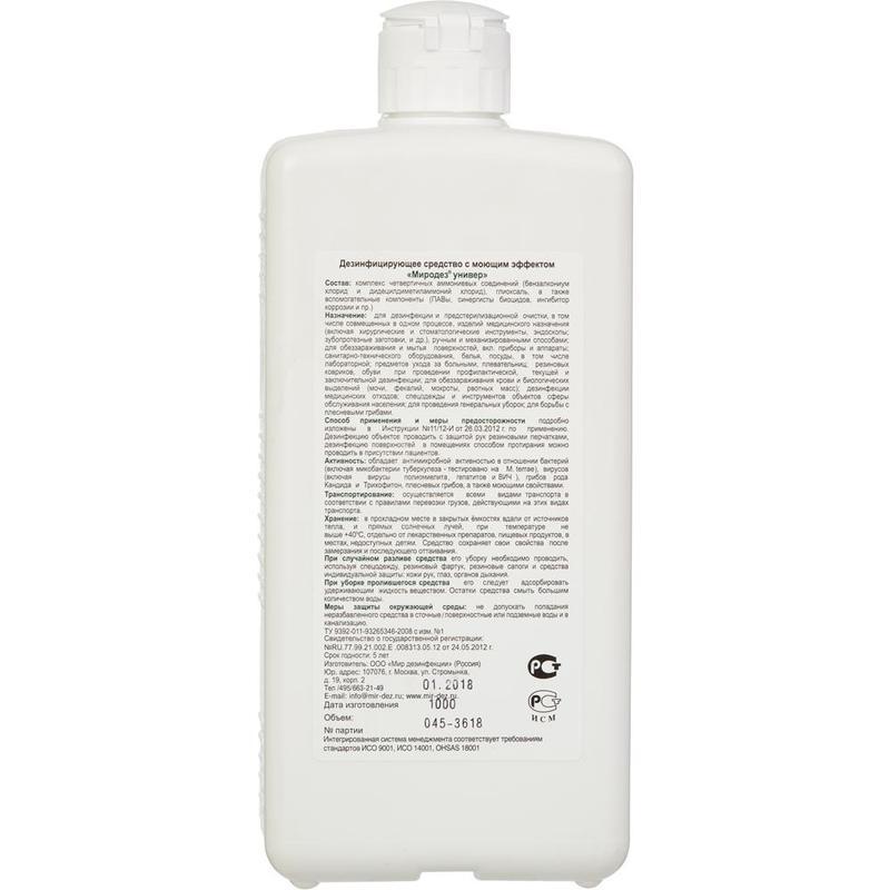Дезинфицирующее средство 'Миродез Универ' 1 л (концентрат). Химический состав дезсредства: ЧАС, альдегид, вспомогательные компоненты. Действующие вещества: алкилдиметилбензиламмоний хлорид (АДБАХ) + дидецилдиметиламмоний хлорид 12 %, глиоксаль 5.7 %, вспомогательные компоненты. Сфера применения: ЛПУ, клинические лаборатории, станции переливания крови, бактериологические лаборатории, инфекционные очаги, предприятия общественного питания, предприятия продовольственной торговли, потребительские рынки, коммунальные объекты (бани, бассейны, гостиницы, общественные туалеты и т.п.), учреждения соцобеспечения, парикмахерские, косметические и (или) массажные салоны, прачечные, санитарный транспорт, отделения неонатологии, предприятия фармацевтической промышленности, учреждения культуры, отдыха (кинотеатры, музеи, театры), спортивные и культурно-оздоровительные комплексы, диагностические лаборатории. Объекты обработки: белье нательное, белье постельное, вращающиеся стоматологические инструменты, выделения больного (моча, фекалии, мокрота), гибкие эндоскопы, жесткая мебель, жесткие эндоскопы, игрушки, ИМН из металлов, резин на основе натурального и силиконового каучука, стекла, пластмасс, ИМН обычные, ИМН одноразовые перед утилизацией, инструменты к эндоскопам, инструменты стоматологические, инструменты хирургические, кровь, лабораторная посуда, медицинские отходы из текстильных материалов (ватные и марлевые тампоны, марля, бинты), мокрота, моча, мусороуборочное оборудование, мусоропроводы, обувь из пластика, резины, одноразовая посуда, пищевые отходы, поверхности в помещениях, поверхности приборов и аппаратов, предметы для мытья посуды, предметы личной гигиены, предметы ухода за больными, рвотные массы, резиновые и полипропиленовые коврики, санитарно-техническое оборудование, санитарный транспорт, слюноотсосы, столовая посуда, стоматологические материалы (оттиски из альгината, силикона, полиэфирной смолы, зубопротезные заготовки, артикуляторы), транспорт для перевозки пищевых продуктов, уборочный инвентарь, фекалии. Основные режимы применения средства (концентрация/время): дезинфекция поверхностей по бактериям, исключая туберкулез (0.01 %/120 мин., 0.05 %/60 мин., 0.1 %/30 мин., 0.2 %/15 мин., 0.5 %/5 мин.), дезинфекция поверхностей по вирусным инфекциям (0.1 %/60 мин., 0.25 %/30 мин., 0.5 %/15 мин.), дезинфекция поверхностей по кандидозу (0.1 %/60 мин., 0.25 %/30 мин., 0.5 %/15 мин.), дезинфекция поверхностей по дерматофитам (0.1 %/60 мин., 0.25 %/30 мин., 0.5 %/15 мин.), дезинфекция поверхностей по туберкулезу (0.5 %/60 мин., 1 %/30 мин.), дезинфекция ИМН при бактериальных, вирусных инфекциях и кандидозе (0.2 %/60 мин., 0.4 %/30 мин.), дезинфекция, совмещенная с ПСО ИМН при бактериальных, вирусных инфекциях и кандидозе (0.2 %/60 мин., 0.4 %/30 мин.), дезинфекция крови (0.5 %/90 мин., 1 %/60 мин., 2 %/30 мин.), дезинфекция мокроты (0.5 %/90 мин., 1 %/60 мин., 2 %/30 мин.), дезинфекция фекалий (0.5 %/90 мин., 1 %/60 мин., 2 %/30 мин.). Класс опасности: при введении в желудок - 3; при нанесении на кожу - 4; рабочего раствора - 4. Активно в отношении: бактерии (Mycobacterium tuberculosi, грамотрицательные бактерии, грамположительные бактерии), вирусы (аденовирусы, атипичной пневмонии, ВИЧ, герпеса, грипп, парагрипп, парентеральных гепатитов, полиомиелит, прочие возбудители ОРВИ, птичьего гриппа (H5N1), ротавирусы, энтеральных гепатитов, энтеровирусы), патогенные грибы (дерматофит