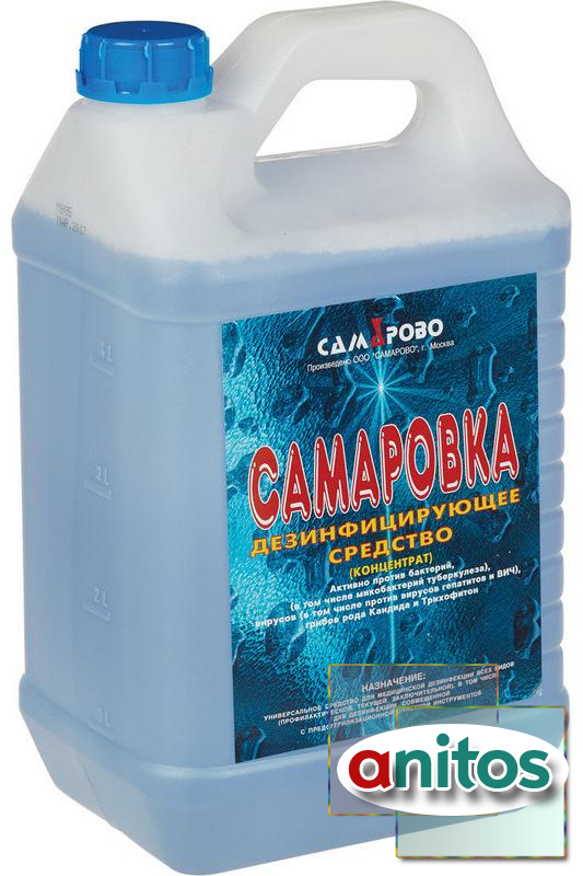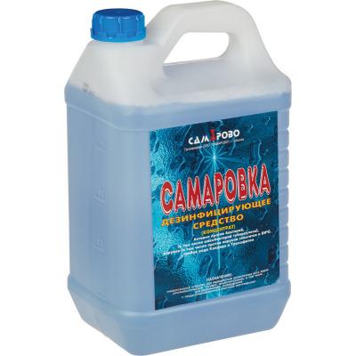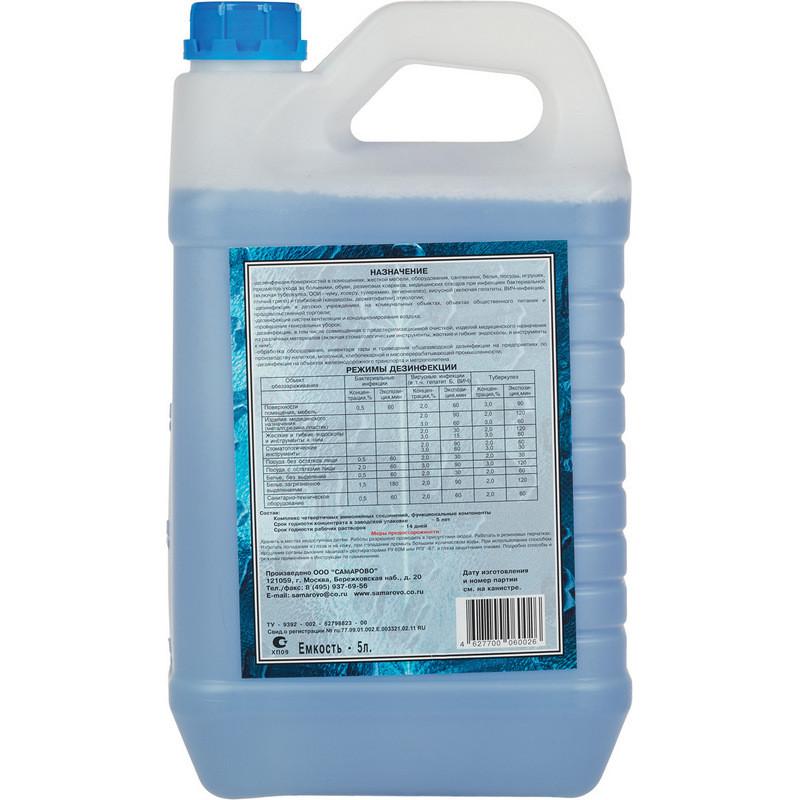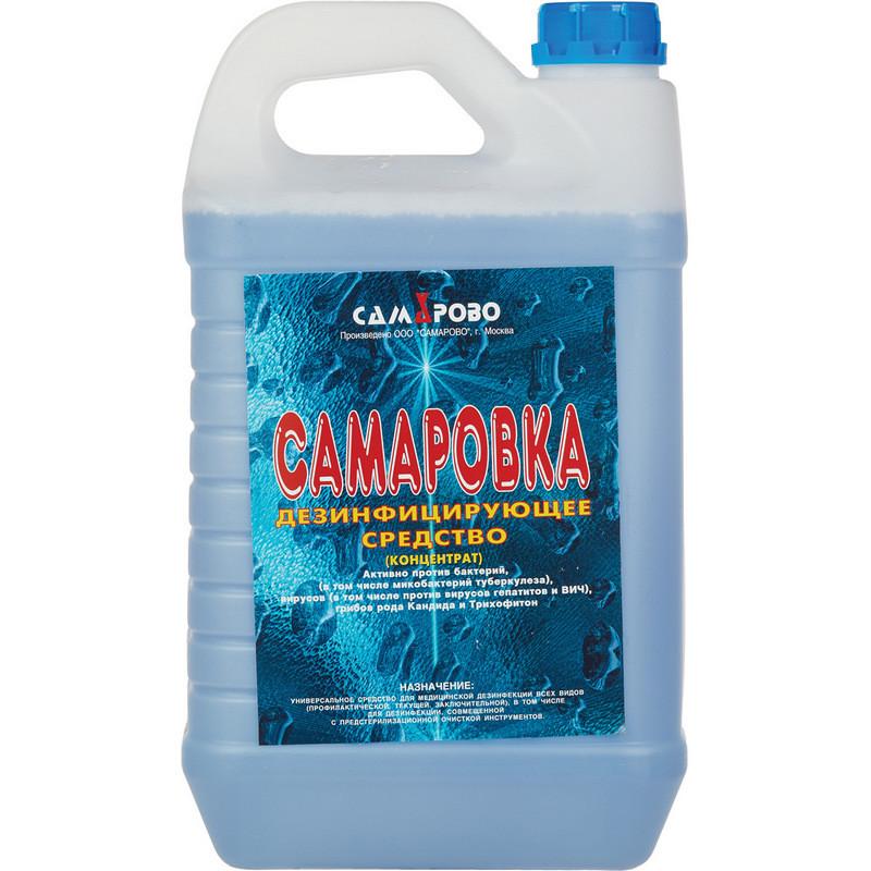 Дезинфицирующее средство 'Самаровка' 5 л (концентрат). Химический состав дезсредства: ЧАС, вспомогательные компоненты. Действующие вещества: алкилдиметилбензиламмоний хлорид (АДБАХ) 4.8 %, алкилдиметилэтилбензиламмоний хлорид 4.8 %, вспомогательные компоненты. Сфера применения: ЛПУ, детские учреждения (детсады, школы и т.п.), инфекционные очаги, предприятия общественного питания, предприятия продовольственной торговли, коммунальные объекты (бани, бассейны, гостиницы, общественные туалеты и т.п.), учреждения культуры и отдыха (кинотеатры, музеи, театры). Объекты обработки: белье нательное, белье постельное, бытовые кондиционеры, вращающиеся стоматологические инструменты, гибкие эндоскопы, жесткая мебель, жесткие эндоскопы, ИМН из металлов, резин на основе натурального и силиконового каучука, стекла, пластмасс, ИМН обычные, инструменты к эндоскопам, инструменты стоматологические, инструменты хирургические, крышные кондиционеры, обувь, поверхности в помещениях, поверхности приборов и аппаратов, предметы ухода за больными, резиновые и полипропиленовые коврики, санитарно-техническое оборудование, системы вентиляции и кондиционирования воздуха, сплит-системы, мультизональные сплит-системы, столовая посуда. Основные режимы применения средства (концентрация/время): дезинфекция поверхностей по бактериям, исключая туберкулез (0.5 %/60 мин., 1 %/30 мин.), дезинфекция поверхностей по вирусным инфекциям (2 %/60 мин., 3 %/30 мин.), дезинфекция поверхностей по кандидозу (2 %/60 мин., 3 %/30 мин.), дезинфекция поверхностей по дерматофитам (3 %/120 мин.), дезинфекция поверхностей по туберкулезу (3 %/90 мин.), дезинфекция ИМН при бактериальных, вирусных инфекциях и кандидозе (2 %/120 мин., 3 %/60 мин.), дезинфекция, совмещенная с ПСО ИМН при бактериальных, вирусных инфекциях и кандидозе (2 %/90 мин.). Класс опасности: при введении в желудок - 4; при нанесении на кожу - 4; рабочего раствора - 4. Активно в отношении: бактерии (Mycobacterium tuberculosi, грамотрицательные бактерии, грамположительные бактерии), вирусы (ВИЧ, парентеральных гепатитов, энтеральных гепатитов), патогенные грибы (дерматофитон, кандида). Срок годности: в упаковке - 5 лет, в рабочем растворе - 14 дней. Страна производства: Россия.