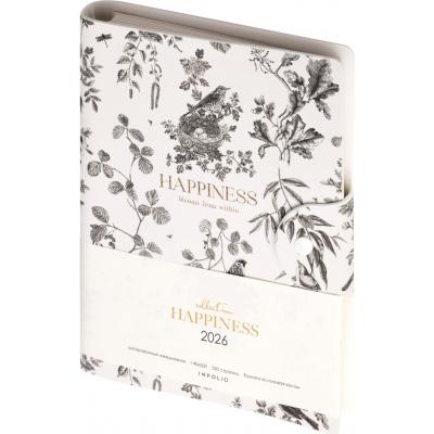 Ежедневник датированный 2026 год InFolio Happiness искусственная кожа А5 160 листов<br><br>Коллекция «„Happiness“» от Infolio — воплощение стиля и утончённости. Вдохновлённая популярной винтажной посудой, она гармонично впишется в современную жизнь, станет верным помощником и прекрасным аксессуаром. Почувствуйте роскошь, привнесите красоту в каждый день, позвольте каждой странице стать частью Вашей жизни!<br>Удобный датированный на 2026 год ежедневник А5 формата (140200 мм) на спирали будет не только незаменимым помощником в ведении дел, но и станет стильным аксессуаром, отражающим индивидуальность владельца. <br>Мягкая обложка из приятной искусственной кожи с цветной печатью и тиснением фольгой имеет фигурный клапан на кнопке, который не позволит растрепаться страницам. Удобное крепление на полускрытой спирали позволит удалять ненужные листы, не повредив при этом сам блок.<br>Датированный внутренний блок в линейку на 160 листов (320 страниц) — из высококачественной бумаги цвета слоновой кости плотностью 70 г/м2. Информационный блок ежедневника включает в себя: титульный лист, календари на 2026-2027 гг и развороты для заметок в начале и конце блока.<br><br><br><br><br><br><br><br><br><br><br><br><br><br><br><br><br><br><br><br><br><br><br><br><br><br><br><br><br><br>