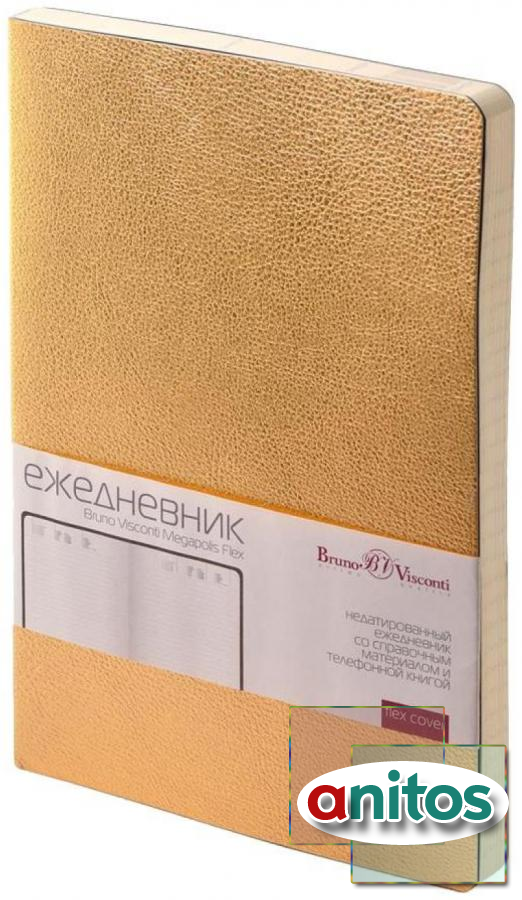 Элегантная закругленная flex обложка из гладкого кожзама имеет гибкую конструкцию. Интегральный переплет позволяет сэкономить место с рабочей сумке или портфеле - ежедневник можно просто свернуть в трубку или согнуть пополам. Недатированный ежедневник формата А5 (140х210 мм) содержит 272 страницы. Для них используется качественный бежевый офсет повышенной плотности (70 г/кв м). Блок не привязан к конкретным датам - они указываются в выделенном поле вверху страницы. Тонированная бумага не дает глазам утомиться даже при длительной работе. Ежедневник также содержит справочную информацию и телефонную книгу. В справочную информацию входят телефонные коды, буквенные коды, города миллионники, автомобильные коды, энергетическая ценность продуктов, национальные праздники, скорость, давление, страны мира, единицы измерения, штрихкоды, термины международной торговли, распад алкоголя в крови, температура, размеры одежды, формат бумаги, религиозные праздники, аэропорты Европы, часовые пояса.