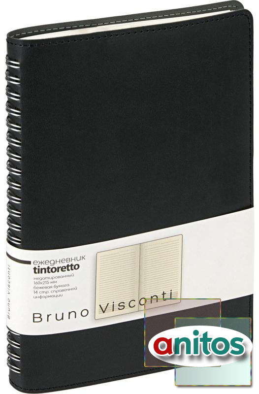 Ежедневник недатированный Bruno Visconti Tintoretto искусственная кожа отсутствует А5 136 листов чёрный<br><br>Недатированный ежедневник формата А5 оснащён полускрытым гребнем, который позволяет раскрывать блок на 360 градусов. Обложка выполнена из чёрной искусственной кожи и дополнена декоративной отстрочкой по краю. Мягкая конструкция делает ежедневник гибким и комфортным в использовании. Внутренний блок включает 272 страницы офсетной тонированной бумаги плотностью 70 г/кв.м с печатью в две краски и сдержанной линовкой. Ежедневник поставляется в подарочной упаковке и подходит для персонализации.