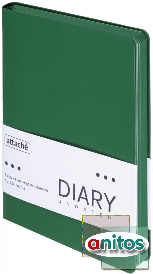 Ежедневник формата A5 подходит для ведения записей и планирования без указания дат. Обложка выполнена из искусственной кожи тёмно-зелёного цвета с тиснением и оформлена в однотонном стиле. Мягкий переплёт делает изделие удобным для повседневного использования, а сшивка блока обеспечивает его надёжность.