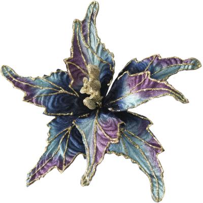 Украшение выполнено из текстиля и металла и имеет высоту 32 см. Этот синий цветок с металлическими золотистыми прожилками идеально подойдёт для украшения высотной ёлки. Пышный цветок добавит объём и гармонично сочетаться с другими игрушками на ёлке, создавая стильный и яркий декор. Нежные лепестки украшены блёстками, которые будут красиво преломлять свет ёлочных фонариков, привлекая внимание и создавая праздничную атмосферу. Цветок крепится на прищепке, что позволяет легко закрепить его на ёлке или в других новогодних композициях. Материал текстиль. Цвет синий. Размер 2032 см.