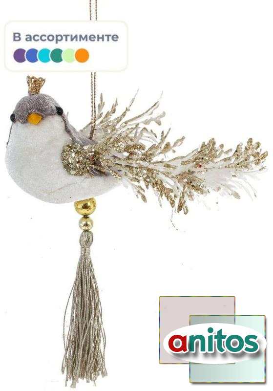 Очаровательная фигурка из мягкого текстиля белого цвета с декоративными элементами, выполненная в форме птицы. Эта игрушка украшена блёстками, пайетками и пушистыми серо-золотыми перьями, которые будут красиво переливаться под светом гирлянд и разноцветных фонариков, создавая атмосферу праздника и волшебства. Светлая фигурка отлично дополнит украшения на ёлке, оформленной в различных стилях. Высота игрушки — 7 см. Товар поставляется в ассортименте цветов (без возможности выбора). Подвешивается на ёлку с помощью подвеса. Материал текстиль. Цвет в ассортименте. Размер 35x7 см