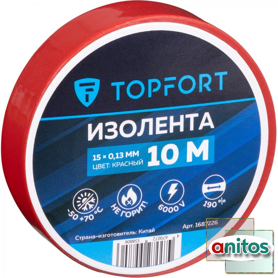 Изолента TOPFORT. Длина — 10 м, ширина ленты — 15 мм. Используется при электротехнических работах для обмотки проводов и кабелей с целью их электроизоляции в промышленности и в быту. Также применяется для надёжного соединения деталей. За счёт эластичности материала и высокой адгезии клеевого состава лента надёжно удерживает соединённые детали и выдерживает большой вес и давление. Изготовлена на основе плёнки из поливинилхлоридного изоляционного пластиката профессионального качества. Благодаря специальным добавкам в составе демонстрирует высокие пользовательские показатели: возможность натяжения до 190%, применимость при экстремальных температурах от 50 до +70 °С. Лента отлично показывает себя как изоляционный материал — выдерживает напряжение до 6000 В. Важная особенность данной изоленты — она не поддерживает горение, что обеспечивает безопасность при возгорании — огонь не распространится при попадании на ленту.