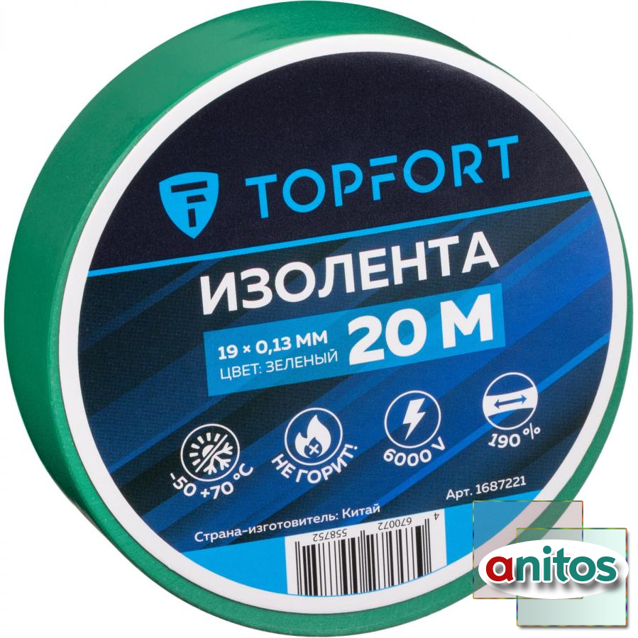 Изолента TOPFORT. Длина — 20 м, ширина ленты — 19 мм. Используется при электротехнических работах для обмотки проводов и кабелей с целью их электроизоляции в промышленности и в быту. Также применяется для надёжного соединения деталей. За счёт эластичности материала и высокой адгезии клеевого состава лента надёжно удерживает соединённые детали и выдерживает большой вес и давление. Изготовлена на основе плёнки из поливинилхлоридного изоляционного пластиката профессионального качества. Благодаря специальным добавкам в составе демонстрирует высокие пользовательские показатели: возможность натяжения до 190%, применимость при экстремальных температурах от 50 до +70 °С. Лента отлично показывает себя как изоляционный материал — выдерживает напряжение до 6000 В. Важная особенность данной изоленты — она не поддерживает горение, что обеспечивает безопасность при возгорании — огонь не распространится при попадании на ленту.