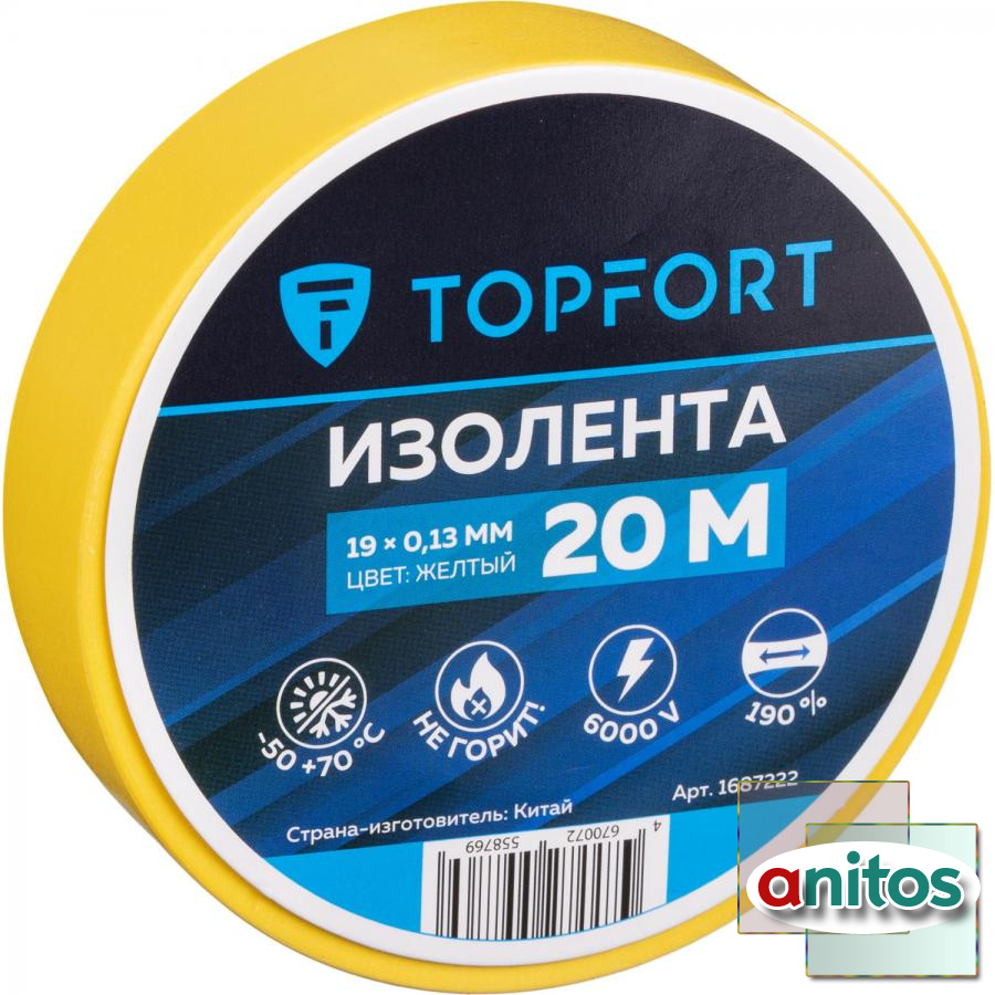 Изолента TOPFORT ПВХ 19 мм x 20 м жёлтая (1687222)<br><br>Изолента TOPFORT. Длина — 20 м, ширина ленты — 19 мм. Используется при электротехнических работах для обмотки проводов и кабелей с целью их электроизоляции в промышленности и в быту. Также применяется для надёжного соединения деталей. За счёт эластичности материала и высокой адгезии клеевого состава лента надёжно удерживает соединённые детали и выдерживает большой вес и давление. Изготовлена на основе плёнки из поливинилхлоридного изоляционного пластиката профессионального качества. Благодаря специальным добавкам в составе демонстрирует высокие пользовательские показатели: возможность натяжения до 190%, применимость при экстремальных температурах от 50 до +70 °С. Лента отлично показывает себя как изоляционный материал — выдерживает напряжение до 6000 В.<br>Важная особенность данной изоленты — она не поддерживает горение, что обеспечивает безопасность при возгорании — огонь не распространится при попадании на ленту.<br><br>Особенности:<br>• Цвет — жёлтый.<br>• Не поддерживает горение.<br>• Коэффициент натяжения — не менее 1,9.<br>• Рабочее напряжение: 6000 В.<br>• Ширина: 19 мм.<br>• Длина: 20 м.<br>• Толщина: 130 мкм.<br><br>Внешний вид и/или характеристики товара могут быть изменены производителем в соответствии с производственным процессом.