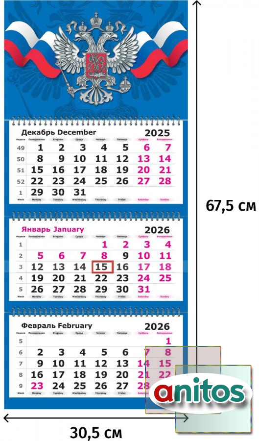 Настенный трёхблочный отрывной календарь. Общий размер календаря — 305675 мм. Шпигель — форматом 305195 мм изготовлен из мелованного целлюлозного картона. Блок — форматом 290140 мм, изготовлен из офсетной бумаги 80 г, печать в 2 цвета. Крепление: каждая секция на металлическом гребне, с бегунком и люверсом, индивидуальная упаковка.