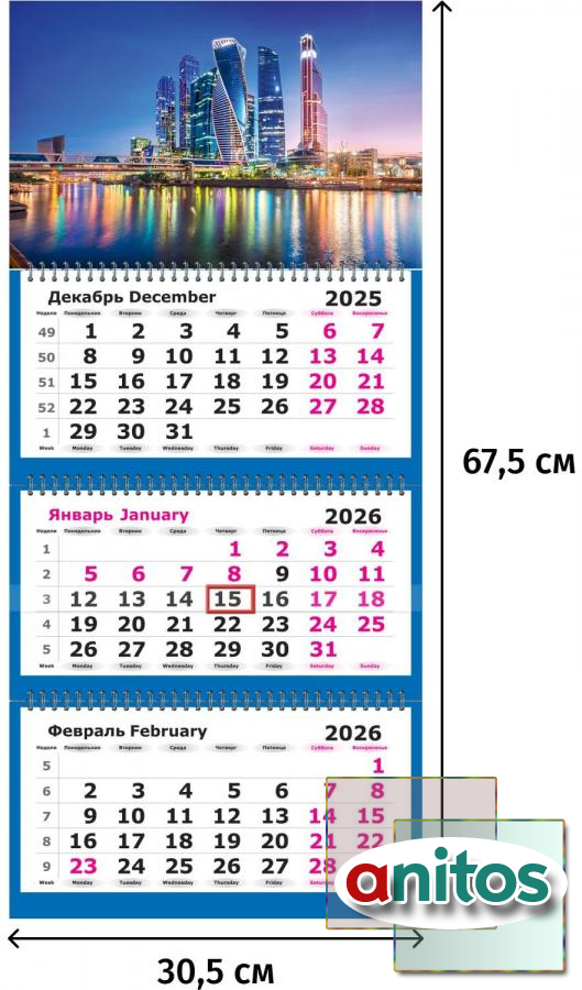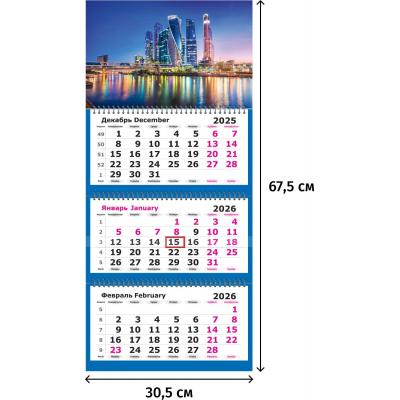 Календарь настенный 3-х блочный 2026 Москва 30.567.5 см<br><br>Настенный трёхблочный отрывной календарь. Общий размер календаря — 305675 мм. Шпигель — форматом 305195 мм изготовлен из мелованного целлюлозного картона. Блок — форматом 290140 мм, изготовлен из офсетной бумаги 80 г, печать в 2 цвета. Крепление: каждая секция на металлическом гребне, с бегунком и люверсом, индивидуальная упаковка.