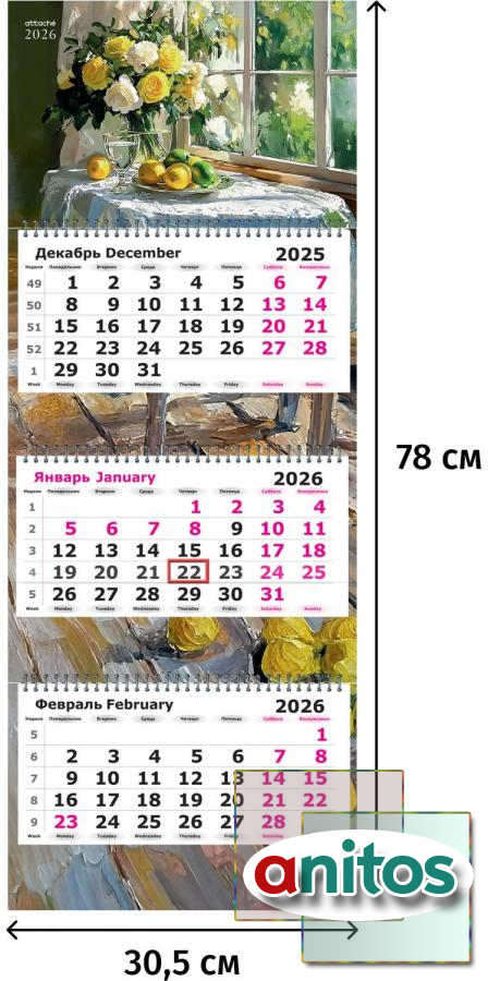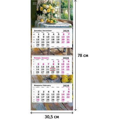 Календарь настенный 3-х блочный 2026 Букет 30.578 см<br><br>Настенный трёхблочный отрывной календарь размером 305780 мм. Шпигель — формат 305195 мм, мелованный картон 300 г/кв.м , блок — формат 290140 мм, офсетная бумага 80 г, печать в 2 цвета, крепление: каждая секция на металлическом гребне, с бегунком и люверсом, индивидуальная упаковка. Полноцветные подложки (плотный картон 300 г/кв.м.) составляют со шпигелем единый дизайн.