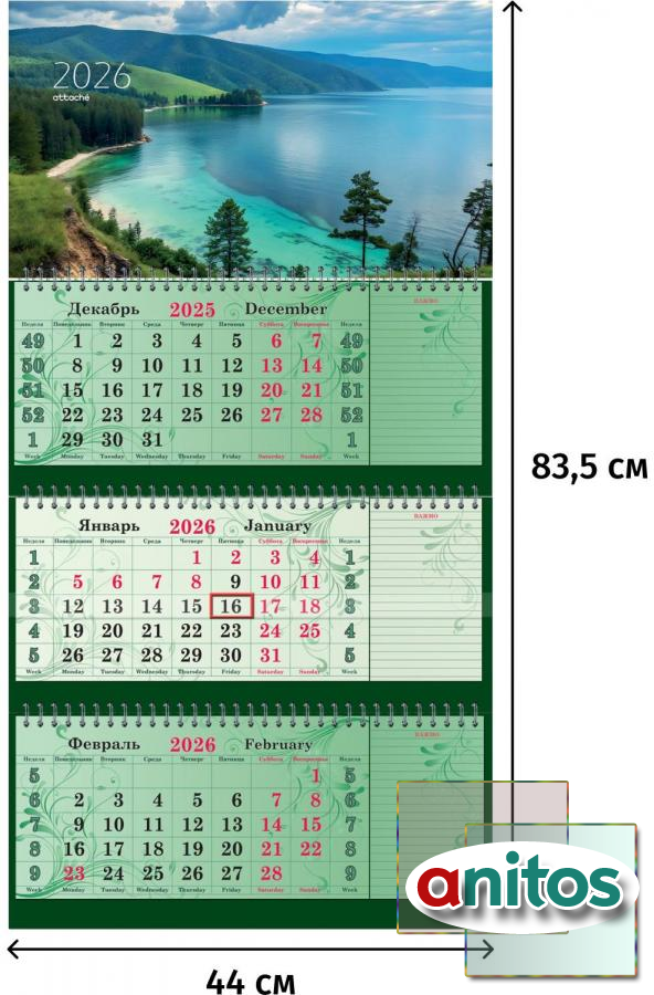 Календарь настенный 3-х блочный 2026 attache,Супер-Прем+блок,Байкал,440х835