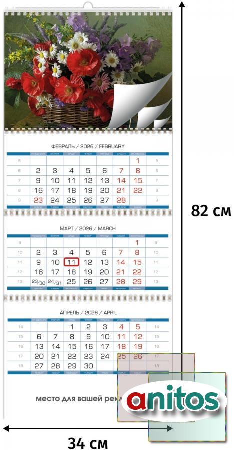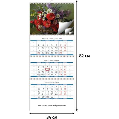 Календарь настенный 3-х блочный квартальный 2026 год Букеты 3482 см<br><br>Настенный квартальный перекидной календарь на 2026 год. 4 сменных постера 340240 мм, мелованная бумага, 4+0, 3 календарных блока 340160 мм, мелованная бумага, 4 пружины, 1 ригель, курсор, место для рекламы 34080 мм. Яркие букеты фотохудожника Марины Филатовой создадут прекрасное настроение и дома и в офисе.