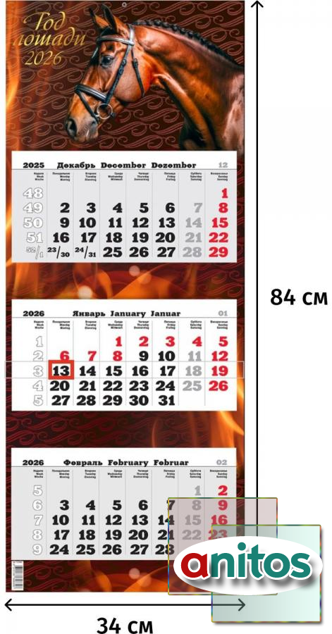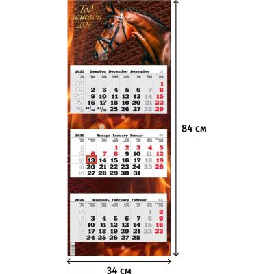 Календарь настенный 3-х блочный 2026 Год лошади 3484 см<br><br>Настенный трёхблочный квартальный календарь премиум класса на единой подложке, с курсором, формат 340840 мм, в индивидуальной упаковке (европакет с подвесом). Состоит из единой подложки с постером и трёх календарных блоков с нумерацией недель. <br>Подложка — мелованный картон 270 г/кв.м, полноцветная печать с отделкой вододисперсионным лаком. <br>Отделка постеров — тиснение золотом, выборочная отделка УФ-лаком с глиттером (не у всех); отделка структурированным УФ—лаком (не у всех). <br>Блоки — офсетная бумага плотностью 70 г/кв.м с перфорацией, печать в две краски. Календарь крепится на стену при помощи кольца (пикколо). Размер в сложенном виде 210340 мм.