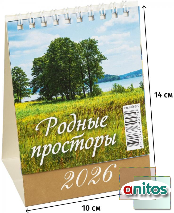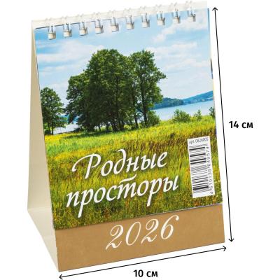 Календарь-домик настольный 2026 Родные просторы 1014 см (0826005)<br><br>Настольный перекидной календарь—домик на металлическом гребне, формат 100140 мм. Состоит из подставки (тонированный золотым пантоном мелованный картон плотностью 250 г/кв.м) и семи листов мелованной глянцевой бумаги плотностью 105 г/кв.м, скреплённых металлическим гребнем. Первый лист — красочная обложка, внутренний блок — шесть двусторонних листов со слайдами и календарными сетками на каждый месяц с нумерацией недель (кроме православных календарей).