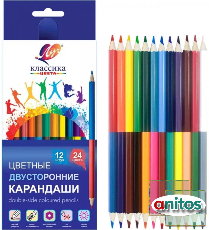 Цветные карандаши с двусторонним грифелем позволяют получить 24 ярких оттенка всего с 12 карандашами. Каждая сторона карандаша окрашена в разный цвет, что делает набор компактным и многофункциональным. Карандаши изготовлены из гипоаллергенной древесины липы, не подвергаются химической и термической обработке и безопасны для детей. Шестигранный корпус диаметром 7 мм обеспечивает удобный захват, а грифель мягкости 4М позволяет создавать насыщенные ровные штрихи. Он не крошится и не ломается благодаря прочному склеиванию с корпусом. Цвета хорошо смешиваются между собой, равномерно ложатся на бумагу и подходят для детского творчества. В комплект входят как базовые, так и дополнительные оттенки: от чёрного и красного до бирюзового, куркумового и фиолетово-красного. Упаковка выполнена из картона с европодвесом.