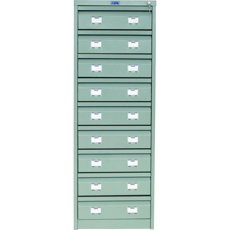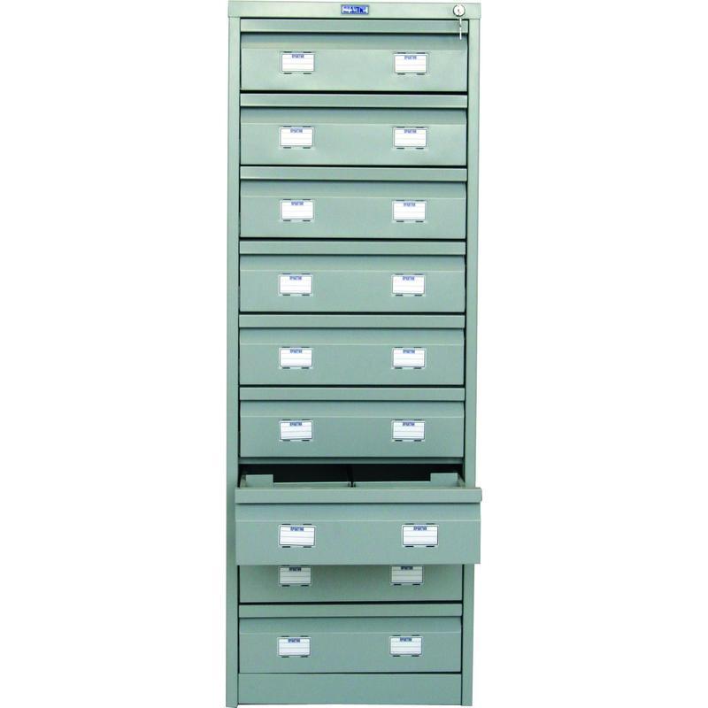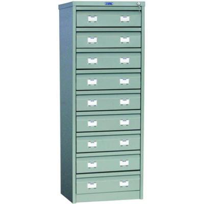 Шкаф картотечный Практик AFC-09 предназначен для систематизации и удобного хранения документации. Идеально подходит для хранения трудовых книжек, паспортов. Ящики выдвигаются на всю глубину и имеют дно. Каждый ящик оборудован одним продольным и двумя поперечными разделителями, размещение которых можно регулировать. Комплектуются центральным замком Практик (2000 комбинаций), с возможностью смены цилиндра. - Телескопические направляющие выдвижных ящиков. - Система полного выдвижения ящиков. - Тип материала - металл - 0.8 мм. - Количество ящиков - 9. - Внутренние размеры ящика (ШхГхВ): 393x560x128 мм. - Формат - А6. - Вместимость одной секции - 55 папок. - Оборудован антиопрокидывающим устройством, не позволяющим одновременно выдвигать более чем один ящик. - Замок - 1 (центральный). - Тип покрытия - порошковое, стойкое к появлению царапин. - Имеют цельносварную конструкцию, увеличивающую жесткость картотеки. - Цвет - серый полуматовый. - Поставляется в собранном виде. Компрессионные пластины для фиксации документов заказываются отдельно.