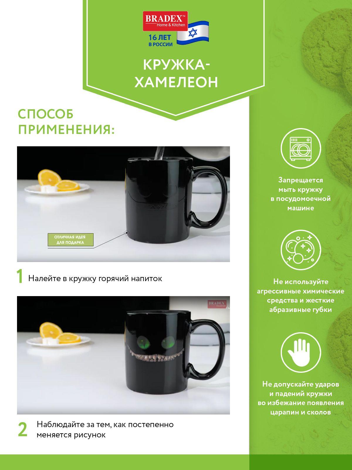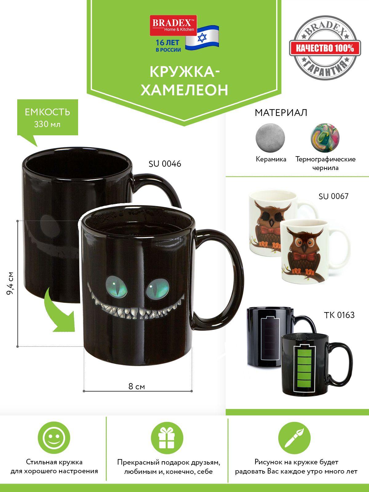 и удивлять всех вокруг? Кружка-хамелеон «ЧЕШИРСКИЙ КОТ» будет поднимать настроение Вам, Вашим гостям или коллегам! • Кружка изготовлена из прочной и долговечной керамики с применением термографических чернил, которые реагируют на температуру жидкости и влияют на рисунок поверхности. Стоит налить внутрь горячий напиток, и на посуде тут же начинает появляться сказочная улыбка знаменитого Чеширского кота. • Кружка-хамелеона «ЧЕШИРСКИЙ КОТ» выполнена из безопасных материалов и нисколько не повредит вкусу и качеству напитка. • Изделие послужит замечательным подарком для любителей чая, кофе и других горячих напитков. Почувствуйте себя настоящим магом с помощью кружки-хамелеона «ЧЕШИРСКИЙ КОТ»!