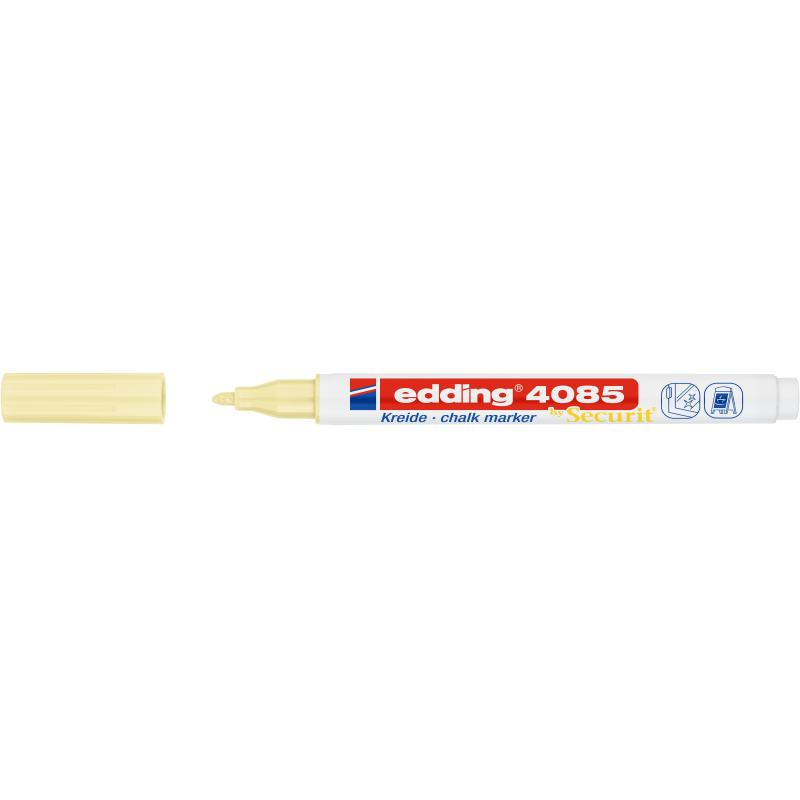 Меловой маркер edding 4085. Цвет пастельный желтый. Предназначен для нанесения рисунков и надписей на гладкие поверхности, такие как стекло, кафель, пластик, меловые доски (в том числе черные). Легко стираются влажной салфеткой. Чернила этого маркера — ни что иное как жидкий мел на водной основе без каких-либо примесей, поэтому данный маркер прекрасно подходит для детей. Edding 4085 — отличный инструмент для воплощения творческих идей дома, но так же рекомендуется для использования в офисах, ресторанах, стекольной и других видах промышленности. Уникальная особенность серии edding 4085 — наличие необычных цветов и тонкая линия письма — всего 1–2 мм, что является большой редкостью для меловых маркеров. Форма наконечника: круглая.