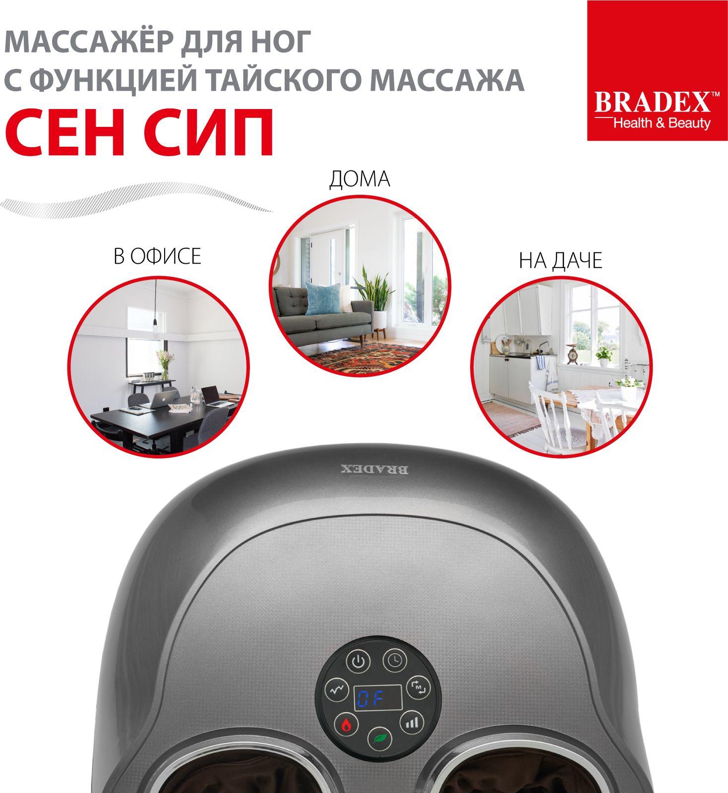 разминающего, роликового, постукивающего массажа, а также компрессии и прогрева, воздействует на рефлекторные зоны стоп и способствует улучшению кровообращения, а также снятию напряжения, мышечной боли в ногах и усталости после физических нагрузок. Сен Сип - это 10 линий жизненной энергии, аккупрессура которых вызывает терапевтический эффект. Режим ионизации воздуха, встроенный в массажер для ног, делает процесс массажа еще более комфортным. Преимущества: ? Максимально комфортная регулировка интенсивности массажа. ? Возможность индивидуальной настройки. ? Универсальный массажер для всей семьи с множеством функций: ? Функция прогрева; ? Функция аэрокомпрессии; ? Режим ионизации; ? Автовыключение.