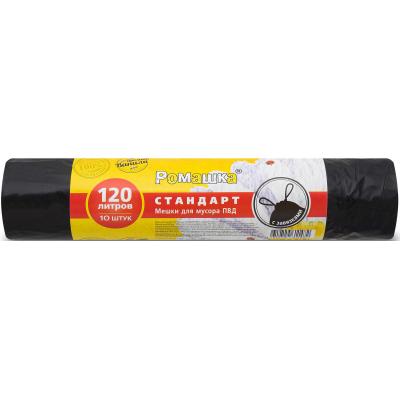 Мешки для мусора Ромашка Стандарт 120 л с завязками черные (ПВД, 30 мкм). Данные пакеты нашли широкое применение в домашнем использовании, в офисе, в производственных помещениях и государственных учреждениях (поликлиниках, школах, детских садах и пр.). Изготовлены из полиэтилена высокого давления (ПВД). Не являются биоразлагаемыми. Ароматизированные (с ароматом лаванды), что позволяет маскировать неприятные запахи. Упакованы по 10 пакетов в рулоне.
