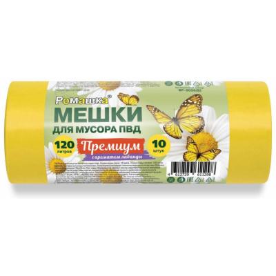 Мешки для мусора Ромашка Премиум 120 л желтые (ПВД, 35 мкм). Данные пакеты нашли широкое применение в домашнем использовании, в офисе, в производственных помещениях и государственных учреждениях (поликлиниках, школах, детских садах и пр.). Изготовлены из полиэтилена высокого давления (ПВД). Не являются ароматизированными и биоразлагаемыми. Упакованы по 10 пакетов в рулоне.