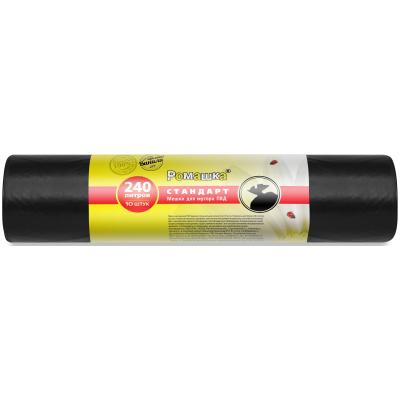 Мешки для мусора Ромашка Стандарт 240 л черные (ПВД, 30 мкм). Данные пакеты нашли широкое применение в домашнем использовании, в офисе, в производственных помещениях и государственных учреждениях (поликлиниках, школах, детских садах и пр.). Изготовлены из полиэтилена высокого давления (ПВД). Не являются ароматизированными и биоразлагаемыми. Упакованы по 10 пакетов в рулоне.