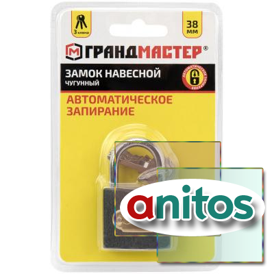 Замок навесной чугунный "Стандарт", ширина 38 мм, английский, 3 ключа, ГРАНДМАСТЕР, 671291