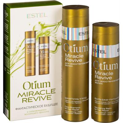 Подарочный набор косметики для женщин Estel Otium Miracle Revive<br><br>Этот косметический набор предназначен для восстановления волос. Он подходит для женщин и применяется для глубокого ухода за волосами. Набор обеспечивает реконструкцию волос изнутри, предотвращает ломкость и тусклость, а также помогает сохранить блеск и здоровье. <br><br>В состав набора входят: <br>— <b>Шампунь-уход для восстановления волос Otium Miracle Revive, 250 мл.</b> Он глубоко очищает волосы, восстанавливает их от корней до кончиков и увлажняет. Формула включает пантолактон и пантенол. <br>— <b>Бальзам-питание для восстановления волос Otium Miracle Revive, 200 мл.</b> Он выполняет глубокую реконструкцию, предотвращает преждевременное появление седины и выпадение. Содержит витамины Е, А, В, Н, кальций и экстракт конского каштана. <br><br>Продукты обладают ароматом с нотами мимозы, ванили, чёрной смородины и сандала.