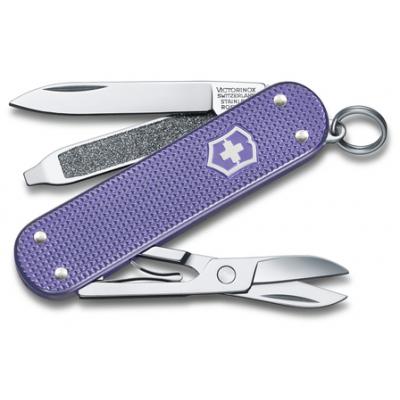 Нож-брелок VICTORINOX Classic SD Alox Colors "Electric Lavender", 5 функций, с лезвием и инструментами из нержавеющей стали иВ алюминиевой рукоятью лавандового цвета.