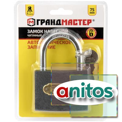 Замок навесной чугунный "Стандарт", ширина 75 мм, английский, 3 ключа, ГРАНДМАСТЕР, 671294