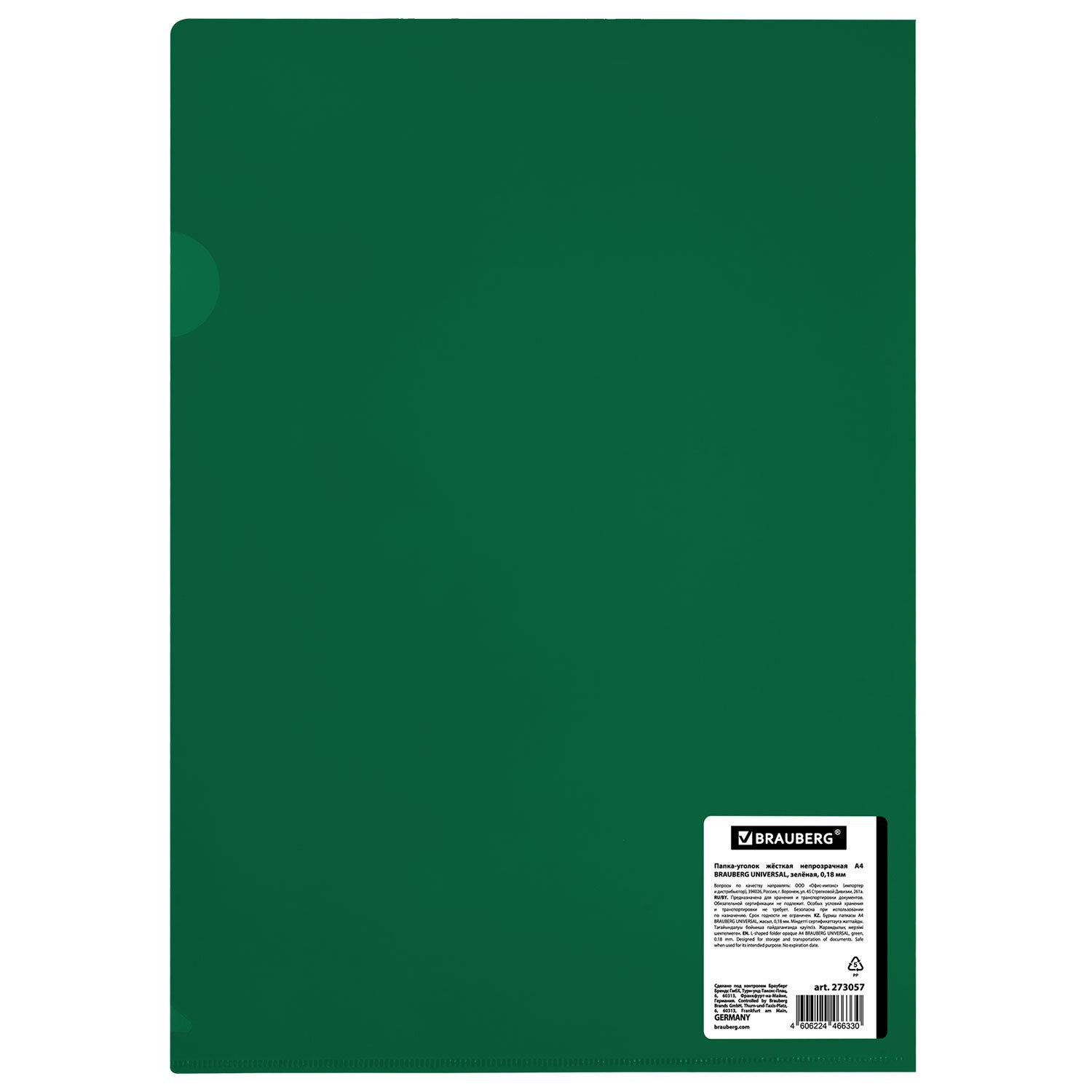 Папка-уголок жесткая непрозрачная А4 BRAUBERG UNIVERSAL, зеленая, 0,18 мм, 273057