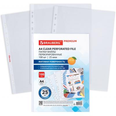 Папки-файлы перфорированные А4 BRAUBERG "PREMIUM", КОМПЛЕКТ 100 шт., матовые, 25 мкм, 273000