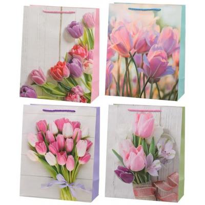 Подарочный пакет: "ТЮЛЬПАНЫ"; плотный, цветной с рисунком, с блёстками; размер 26*32*12 см.