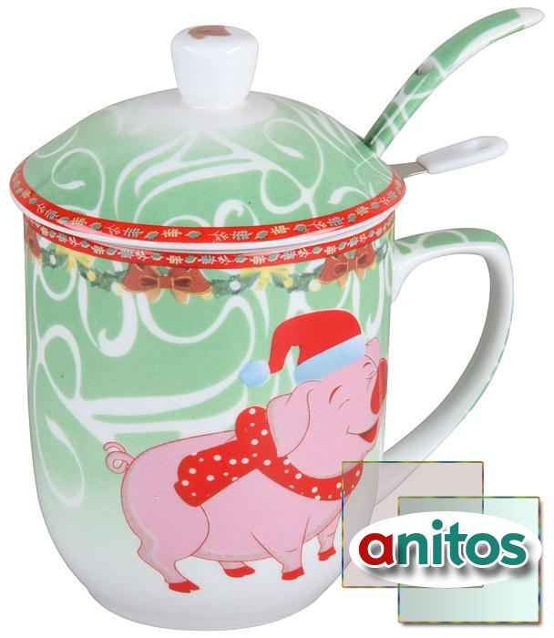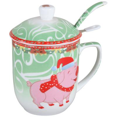 R-260035 Кружка с заварником и ложкой с новогодним дизайном. Керамика. 300мл