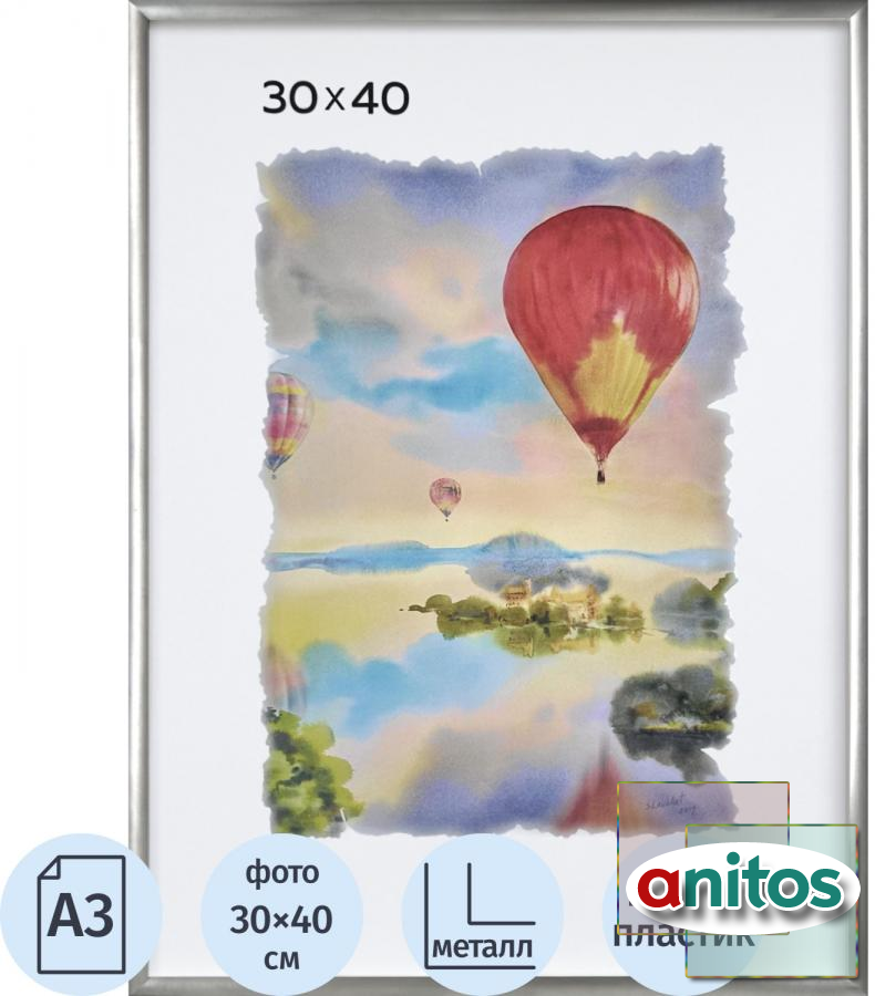 Алюминиевая рамка 3040 см из профиля шириной 8 мм, задник из плотного ДВП, защитная лицевая вставка из ПЭТ (тонкий прозрачный пластик), бумажная цветная вставка, металлическая фурнитура (поворотные зажимы), которые являются подвесами для вертикального или горизонтального крепления на стене.