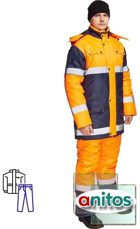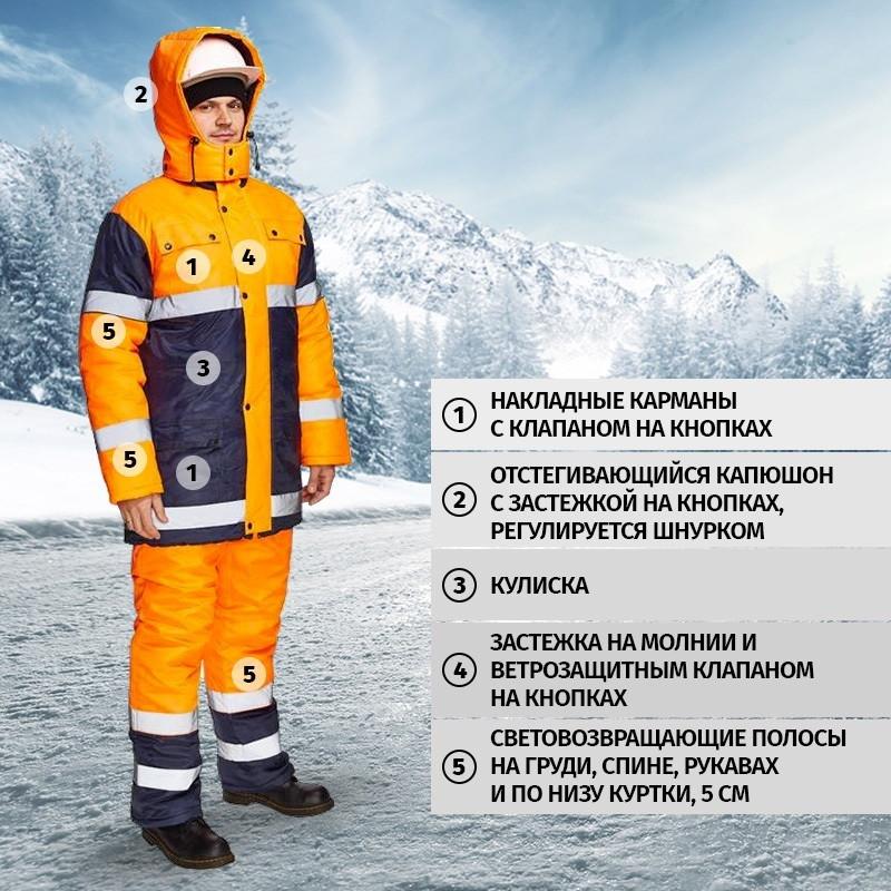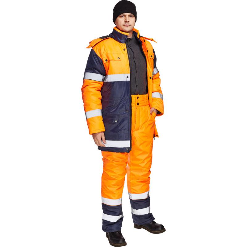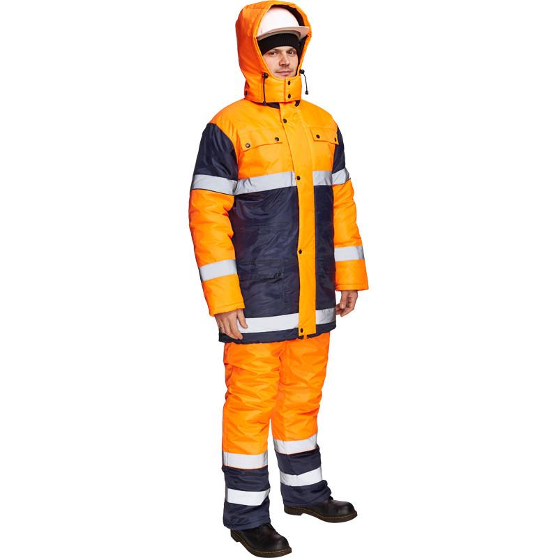 Костюм зимний мужской "Спектр-1"с СОП (куртка и брюки). Размер: 44-46. Рост: 182-188. Ткань верха - "Оксфорд" (100% полиэфир, плотность 85 г/кв.м.), подкладка - 100% полиэстер. Костюм утеплен синтепоном, плотностью - 360 г/кв.м (основа) и 240 г/кв.м (ноги/руки). Технология изготовления термоскрепленного синтепона (евросинтепона) позволяет использовать данный утеплитель для создания более тонких изделий с сохранением термозащитных свойств. Важными преимуществами утеплителя являются легкость и хорошая пластичность, что улучшает подвижность в костюме. А также исключение миграции волокна через ткани верха и подкладки за счет скрепления слоев. Куртка с теплым отстегивающимся капюшоном, внутри на поясе - кулиска, регулирующая объем. В рукава вшиты трикотажные манжеты. Брюки с высоким поясом. Класс риска, класс защиты (повышенная видимость): 2. Класс риска, класс защиты (защиты от пониженных температур): 2. Климатический пояс: III. ГОСТ 12.4.303-2016, ГОСТ 12.4.281-2021 Подобрать размер