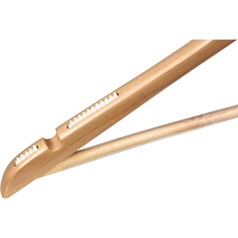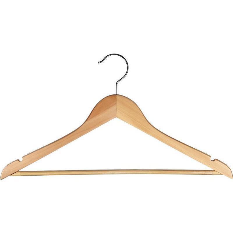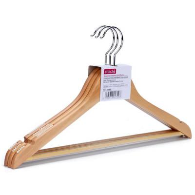 Вешалка-плечики 48-50 размера Attache изготовлена из натуральной древесины (схима) с антискользящими вставками, выемками и перекладиной для брюк, юбок. Поставляется по 3 штуки в упаковке.