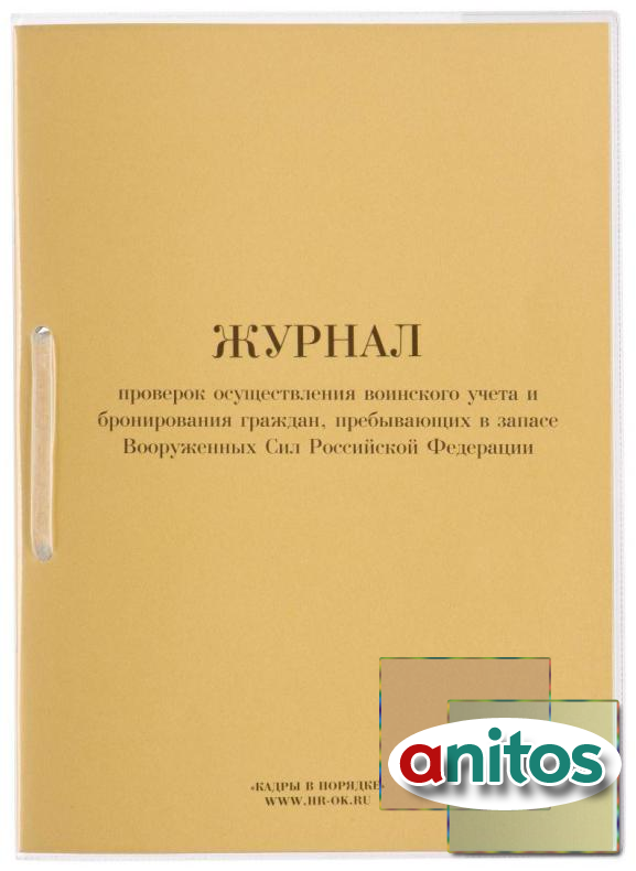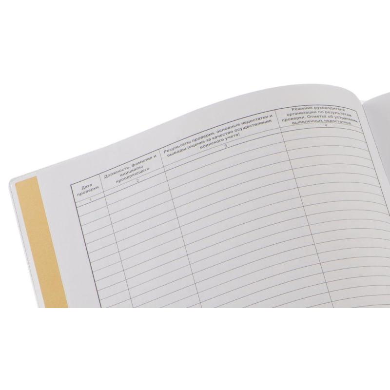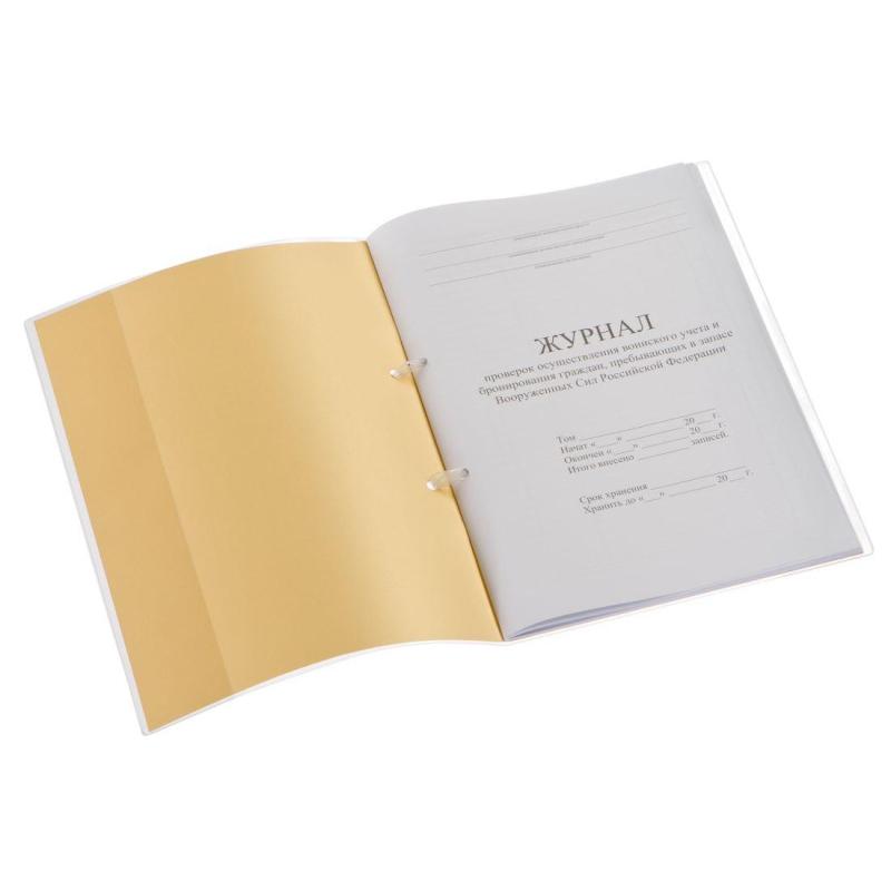 Журнал проверок осуществления воинского учета и бронирования граждан, пребывающих в запасе Вооруженных Сил Российской Федерации применяется для внесения сведений о проверках, выявленных нарушениях и предписаниях об устранении выявленных нарушений. <br>Журнал соответствует требованиям «Инструкции об организации работы по обеспечению функционирования системы воинского учета» (утв. приказом Министра обороны РФ от 22 ноября 2021 г. N 700). Приложение 29. Обязательного к исполнению с 08.02.2022 и требованиям «Методические рекомендации по ведению воинского учета в организациях» (2017), утвержденные Генштабом Вооруженных Сил РФ 11.07.2017. <br>Журнал содержит следующие графы: <br>1. Дата проверки; <br>2. Должность, фамилия, инициалы проверяющего; <br>3. Результаты проверки, основные недостатки и выводы (оценка за качество осуществления воинского учета); <br>4. Решение руководителя организации по результатам проверки. Отметка об устранении выявленных недостатков.<br>Журнал учета прошнурован, пронумерован, опломбирован номерной голографической пломбой. Формат: A4 (210288 мм). Внутренний блок — офсетная белая бумага, плотность бумаги 80 г/кв.м, 32 листа. Обложка — золотистый картон. Дополнительно съемная обложка из прозрачного ПВХ.